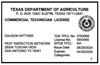 Wittner Inspection Services, LLC is licensed through the Pest Inspection Network (TPCL #0783068).